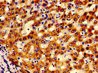IHC image of PACO38066 diluted at 1:600 and staining in paraffin-embedded human liver cancer performed on a Leica BondTM system. After dewaxing and hydration, antigen retrieval was mediated by high pressure in a citrate buffer (pH 6.0). Section was blocked with 10% normal goat serum 30min at RT. Then primary antibody (1% BSA) was incubated at 4°C overnight. The primary is detected by a biotinylated secondary antibody and visualized using an HRP conjugated SP system.