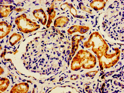 IHC image of PACO38066 diluted at 1:600 and staining in paraffin-embedded human kidney tissue performed on a Leica BondTM system. After dewaxing and hydration, antigen retrieval was mediated by high pressure in a citrate buffer (pH 6.0). Section was blocked with 10% normal goat serum 30min at RT. Then primary antibody (1% BSA) was incubated at 4°C overnight. The primary is detected by a biotinylated secondary antibody and visualized using an HRP conjugated SP system.