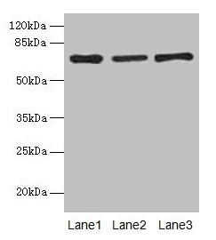Western blot All lanes: Afp antibody at 10µg/ml Lane 1: HepG2 whole cell lysate Lane 2: Rat liver tissue Lane 3: 293T whole cell lysate Secondary Goat polyclonal to rabbit IgG at 1/10000 dilution Predicted band size: 68 kDa Observed band size: 68 kDa