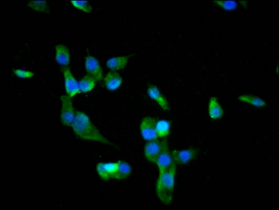 Immunofluorescence staining of SH-SY5Y cells with PACO60392 at 1:66, counter-stained with DAPI. The cells were fixed in 4% formaldehyde, permeabilized using 0.2% Triton X-100 and blocked in 10% normal Goat Serum. The cells were then incubated with the antibody overnight at 4°C. The secondary antibody was Alexa Fluor 488-congugated AffiniPure Goat Anti-Rabbit IgG(H+L).