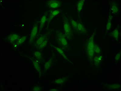 Immunofluorescence staining of Hela cells with PACO57536 at 1:266, counter-stained with DAPI. The cells were fixed in 4% formaldehyde, permeabilized using 0.2% Triton X-100 and blocked in 10% normal Goat Serum. The cells were then incubated with the antibody overnight at 4°C. The secondary antibody was Alexa Fluor 488-congugated AffiniPure Goat Anti-Rabbit IgG(H+L).