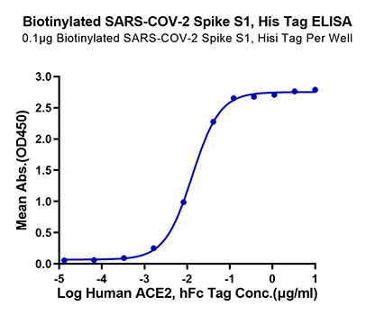 ![]() | Immobilized Biotinylated SARS- COV-2 Spike S1, Hisi Tag at 1μg/ml (100μl/well) on the streptavidin precoated plate (5μg/ml). Dose response curve for Human ACE2, hFc Tag with the EC50 of 13.2ng/ml determined by ELISA. |