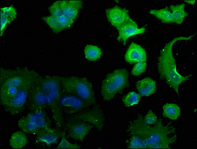 Immunofluorescence staining of MCF-7 cells with PACO63631 at 1:50, counter-stained with DAPI. The cells were fixed in 4% formaldehyde, permeabilized using 0.2% Triton X-100 and blocked in 10% normal Goat Serum. The cells were then incubated with the antibody overnight at 4°C. The secondary antibody was Alexa Fluor 488-congugated AffiniPure Goat Anti-Rabbit IgG(H+L).