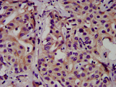 IHC image of PACO57696 diluted at 1:500 and staining in paraffin-embedded human liver cancer performed on a Leica BondTM system. After dewaxing and hydration, antigen retrieval was mediated by high pressure in a citrate buffer (pH 6.0). Section was blocked with 10% normal goat serum 30min at RT. Then primary antibody (1% BSA) was incubated at 4°C overnight. The primary is detected by a biotinylated secondary antibody and visualized using an HRP conjugated SP system.