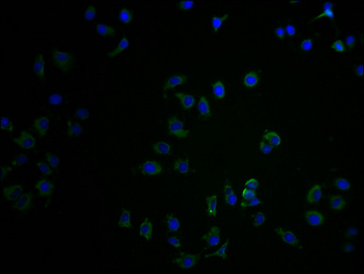 Immunofluorescence staining of A549 cells with PACO64215 at 1:100, counter-stained with DAPI. The cells were fixed in 4% formaldehyde and blocked in 10% normal Goat Serum. The cells were then incubated with the antibody overnight at 4°C. The secondary antibody was Alexa Fluor 488-congugated AffiniPure Goat Anti-Rabbit IgG(H+L).