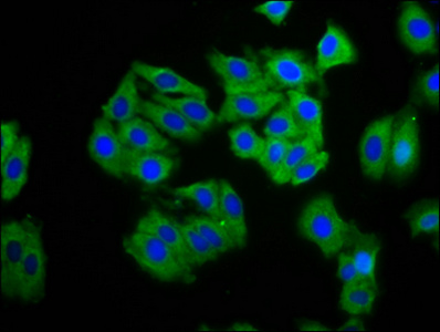 Immunofluorescence staining of HepG2 cells with PACO59700 at 1:100, counter-stained with DAPI. The cells were fixed in 4% formaldehyde, permeabilized using 0.2% Triton X-100 and blocked in 10% normal Goat Serum. The cells were then incubated with the antibody overnight at 4°C. The secondary antibody was Alexa Fluor 488-congugated AffiniPure Goat Anti-Rabbit IgG(H+L).