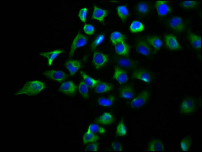 Immunofluorescence staining of A549 cells with PACO60164 at 1:133, counter-stained with DAPI. The cells were fixed in 4% formaldehyde, permeabilized using 0.2% Triton X-100 and blocked in 10% normal Goat Serum. The cells were then incubated with the antibody overnight at 4°C. The secondary antibody was Alexa Fluor 488-congugated AffiniPure Goat Anti-Rabbit IgG(H+L).