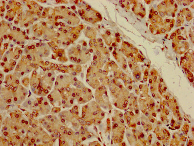 IHC image of PACO26365 diluted at 1:100 and staining in paraffin-embedded human pancreatic tissue performed on a Leica BondTM system. After dewaxing and hydration, antigen retrieval was mediated by high pressure in a citrate buffer (pH 6.0). Section was blocked with 10% normal goat serum 30min at RT. Then primary antibody (1% BSA) was incubated at 4°C overnight. The primary is detected by a biotinylated secondary antibody and visualized using an HRP conjugated SP system.