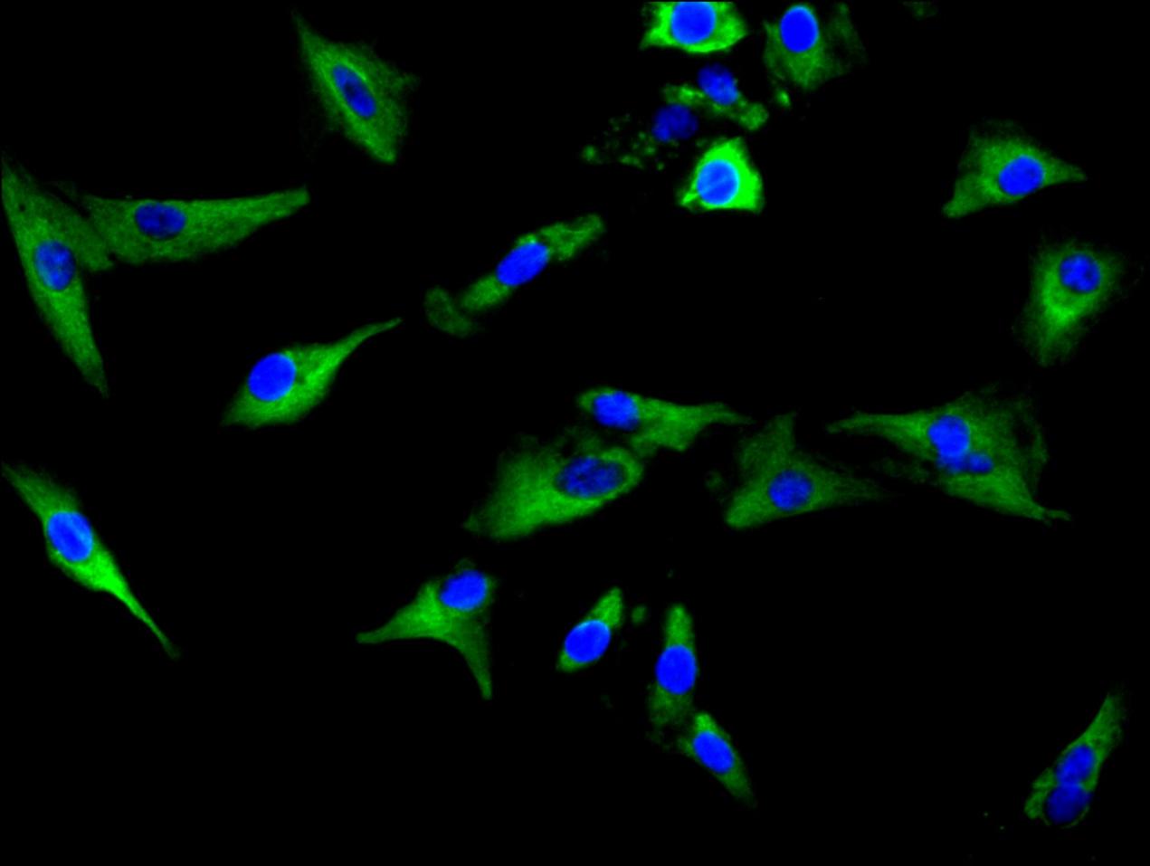 Immunofluorescence staining of Hela cell with 5% goat serum, counter-stained with DAPI. The cells were fixed in 4% formaldehyde and blocked in 10% normal Goat Serum. The cells were then incubated with the antibody overnight at 4C. The secondary antibody was Alexa Fluor 488-congugated AffiniPure Goat Anti-Rabbit IgG(H+L).