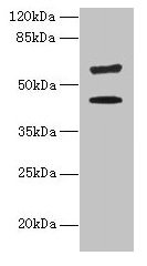Western blot All lanes: KRT73 antibody at 4µg/ml + HepG2 whole cell lysate Secondary Goat polyclonal to rabbit IgG at 1/10000 dilution Predicted band size: 59, 42 kDa Observed band size: 59, 42 kDa