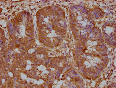 IHC image of PACO63687 diluted at 1:200 and staining in paraffin-embedded human colon cancer performed on a Leica BondTM system. After dewaxing and hydration, antigen retrieval was mediated by high pressure in a citrate buffer (pH 6.0). Section was blocked with 10% normal goat serum 30min at RT. Then primary antibody (1% BSA) was incubated at 4°C overnight. The primary is detected by a biotinylated secondary antibody and visualized using an HRP conjugated SP system.
