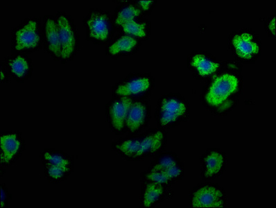Immunofluorescence staining of HepG2 cells with PACO63687 at 1:100, counter-stained with DAPI. The cells were fixed in 4% formaldehyde, permeabilized using 0.2% Triton X-100 and blocked in 10% normal Goat Serum. The cells were then incubated with the antibody overnight at 4°C. The secondary antibody was Alexa Fluor 488-congugated AffiniPure Goat Anti-Rabbit IgG(H+L).