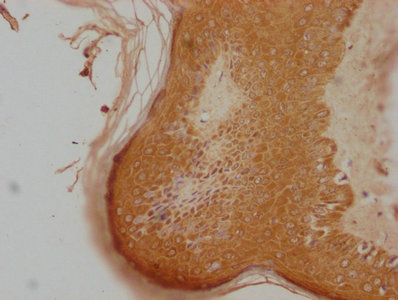 IHC image of PACO63411 diluted at 1:100 and staining in paraffin-embedded human skin tissue performed on a Leica BondTM system. After dewaxing and hydration, antigen retrieval was mediated by high pressure in a citrate buffer (pH 6.0). Section was blocked with 10% normal goat serum 30min at RT. Then primary antibody (1% BSA) was incubated at 4°C overnight. The primary is detected by a biotinylated secondary antibody and visualized using an HRP conjugated SP system.