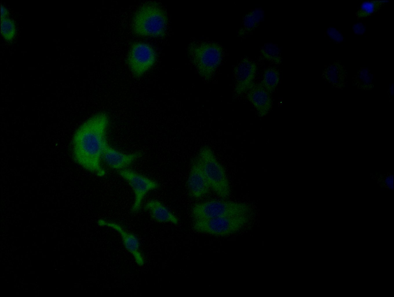 Immunofluorescence staining of HepG2 cell with PACO41618 at 1:25, counter-stained with DAPI. The cells were fixed in 4% formaldehyde and blocked in 10% normal Goat Serum. The cells were then incubated with the antibody overnight at 4°C. The secondary antibody was Alexa Fluor 488-congugated AffiniPure Goat Anti-Rabbit IgG(H+L).
