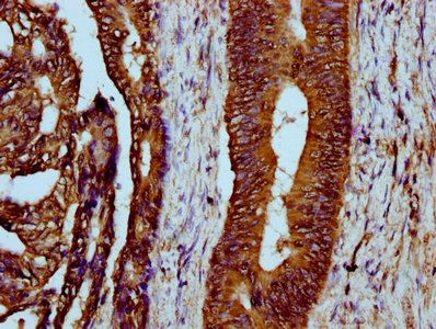 IHC image of PACO59425 diluted at 1:300 and staining in paraffin-embedded human colon cancer performed on a Leica BondTM system. After dewaxing and hydration, antigen retrieval was mediated by high pressure in a citrate buffer (pH 6.0). Section was blocked with 10% normal goat serum 30min at RT. Then primary antibody (1% BSA) was incubated at 4°C overnight. The primary is detected by a biotinylated secondary antibody and visualized using an HRP conjugated SP system.