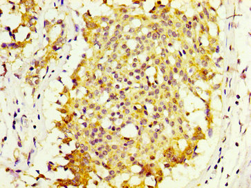 IHC image of PACO56202 diluted at 1:600 and staining in paraffin-embedded human breast cancer performed on a Leica BondTM system. After dewaxing and hydration, antigen retrieval was mediated by high pressure in a citrate buffer (pH 6.0). Section was blocked with 10% normal goat serum 30min at RT. Then primary antibody (1% BSA) was incubated at 4°C overnight. The primary is detected by a biotinylated secondary antibody and visualized using an HRP conjugated SP system.