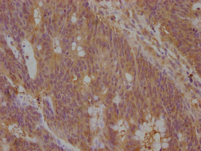 IHC image of PACO63527 diluted at 1:100 and staining in paraffin-embedded human colon cancer performed on a Leica BondTM system. After dewaxing and hydration, antigen retrieval was mediated by high pressure in a citrate buffer (pH 6.0). Section was blocked with 10% normal goat serum 30min at RT. Then primary antibody (1% BSA) was incubated at 4°C overnight. The primary is detected by a biotinylated secondary antibody and visualized using an HRP conjugated SP system.