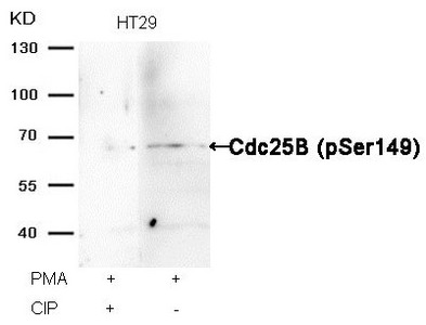 Western blot analysis of extracts from HT29 cells, treated with PMA or calf intestinal phosphatase (CIP), using Cdc25B (Phospho-Ser149) Antibody.