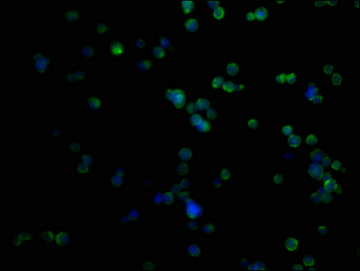 Immunofluorescence staining of K562 cells with PACO63703 at 1:50, counter-stained with DAPI. The cells were fixed in 4% formaldehyde, permeabilized using 0.2% Triton X-100 and blocked in 10% normal Goat Serum. The cells were then incubated with the antibody overnight at 4°C. The secondary antibody was Alexa Fluor 488-congugated AffiniPure Goat Anti-Rabbit IgG(H+L).