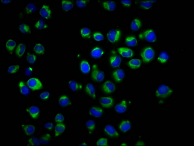 Immunofluorescence staining of Hela cells with PACO60276 at 1:166, counter-stained with DAPI. The cells were fixed in 4% formaldehyde, permeabilized using 0.2% Triton X-100 and blocked in 10% normal Goat Serum. The cells were then incubated with the antibody overnight at 4°C. The secondary antibody was Alexa Fluor 488-congugated AffiniPure Goat Anti-Rabbit IgG(H+L).
