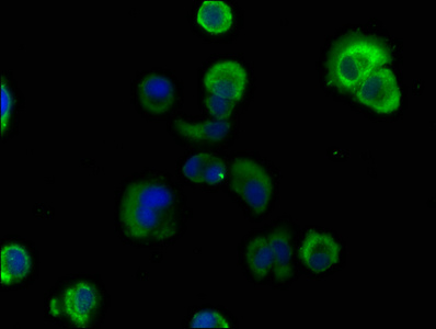 Immunofluorescence staining of MCF-7 cells with PACO62199 at 1:100, counter-stained with DAPI. The cells were fixed in 4% formaldehyde, permeabilized using 0.2% Triton X-100 and blocked in 10% normal Goat Serum. The cells were then incubated with the antibody overnight at 4°C. The secondary antibody was Alexa Fluor 488-congugated AffiniPure Goat Anti-Rabbit IgG(H+L).
