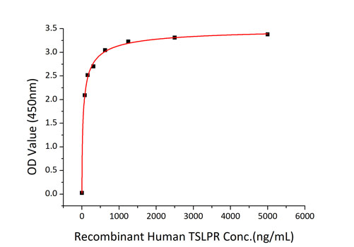 ![]() | Immobilized Recombinant Human TSLP at 2μg/mL (100 μL/well) can bind Recombinant Human TSLPR with a linear range of 20-90 ng/mL. |