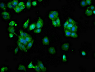 Immunofluorescence staining of HepG2 cells with PACO55766 at 1:133, counter-stained with DAPI. The cells were fixed in 4% formaldehyde, permeabilized using 0.2% Triton X-100 and blocked in 10% normal Goat Serum. The cells were then incubated with the antibody overnight at 4°C. The secondary antibody was Alexa Fluor 488-congugated AffiniPure Goat Anti-Rabbit IgG(H+L).