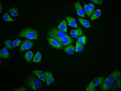 Immunofluorescence staining of Hela cells with PACO60156 at 1:166, counter-stained with DAPI. The cells were fixed in 4% formaldehyde, permeabilized using 0.2% Triton X-100 and blocked in 10% normal Goat Serum. The cells were then incubated with the antibody overnight at 4°C. The secondary antibody was Alexa Fluor 488-congugated AffiniPure Goat Anti-Rabbit IgG(H+L).