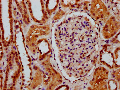 IHC image of PACO59441 diluted at 1:600 and staining in paraffin-embedded human kidney tissue performed on a Leica BondTM system. After dewaxing and hydration, antigen retrieval was mediated by high pressure in a citrate buffer (pH 6.0). Section was blocked with 10% normal goat serum 30min at RT. Then primary antibody (1% BSA) was incubated at 4°C overnight. The primary is detected by a biotinylated secondary antibody and visualized using an HRP conjugated SP system.