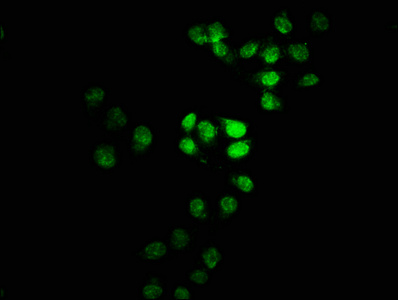 Immunofluorescence staining of Hela cells with PACO62387 at 1:100, counter-stained with DAPI. The cells were fixed in 4% formaldehyde, permeabilized using 0.2% Triton X-100 and blocked in 10% normal Goat Serum. The cells were then incubated with the antibody overnight at 4°C. The secondary antibody was Alexa Fluor 488-congugated AffiniPure Goat Anti-Rabbit IgG(H+L).