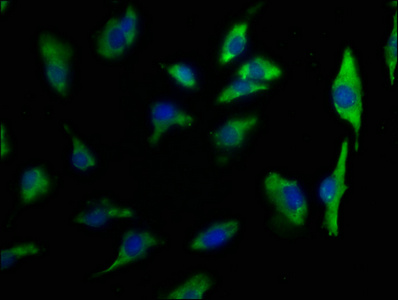 Immunofluorescence staining of U251 cells with PACO63663 at 1:50, counter-stained with DAPI. The cells were fixed in 4% formaldehyde, permeabilized using 0.2% Triton X-100 and blocked in 10% normal Goat Serum. The cells were then incubated with the antibody overnight at 4°C. The secondary antibody was Alexa Fluor 488-congugated AffiniPure Goat Anti-Rabbit IgG(H+L).