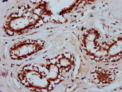 IHC image of PACO59289 diluted at 1:400 and staining in paraffin-embedded human breast cancer performed on a Leica BondTM system. After dewaxing and hydration, antigen retrieval was mediated by high pressure in a citrate buffer (pH 6.0). Section was blocked with 10% normal goat serum 30min at RT. Then primary antibody (1% BSA) was incubated at 4°C overnight. The primary is detected by a biotinylated secondary antibody and visualized using an HRP conjugated SP system.