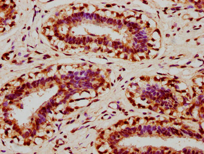 IHC image of PACO60733 diluted at 1:400 and staining in paraffin-embedded human breast cancer performed on a Leica BondTM system. After dewaxing and hydration, antigen retrieval was mediated by high pressure in a citrate buffer (pH 6.0). Section was blocked with 10% normal goat serum 30min at RT. Then primary antibody (1% BSA) was incubated at 4°C overnight. The primary is detected by a biotinylated secondary antibody and visualized using an HRP conjugated SP system.