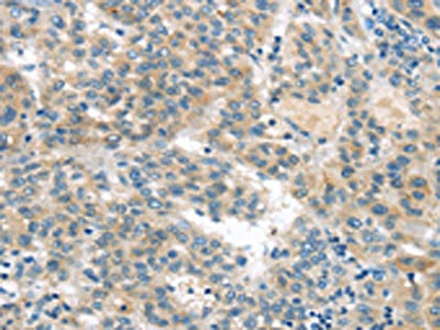 The image on the left is immunohistochemistry of paraffin-embedded Human liver cancer tissue using PACO20851 at dilution 1/20, on the right is treated with synthetic peptide. (Original magnification: ×200)
