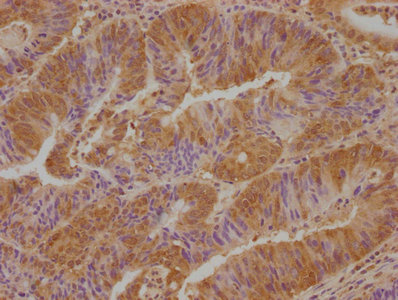 IHC image of PACO63463 diluted at 1:100 and staining in paraffin-embedded human colon cancer performed on a Leica BondTM system. After dewaxing and hydration, antigen retrieval was mediated by high pressure in a citrate buffer (pH 6.0). Section was blocked with 10% normal goat serum 30min at RT. Then primary antibody (1% BSA) was incubated at 4°C overnight. The primary is detected by a biotinylated secondary antibody and visualized using an HRP conjugated SP system.