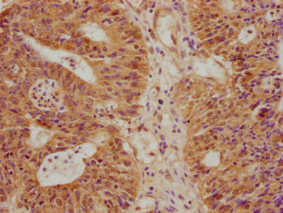 IHC image of PACO63175 diluted at 1:100 and staining in paraffin-embedded human colon cancer performed on a Leica BondTM system. After dewaxing and hydration, antigen retrieval was mediated by high pressure in a citrate buffer (pH 6.0). Section was blocked with 10% normal goat serum 30min at RT. Then primary antibody (1% BSA) was incubated at 4°C overnight. The primary is detected by a biotinylated secondary antibody and visualized using an HRP conjugated SP system.